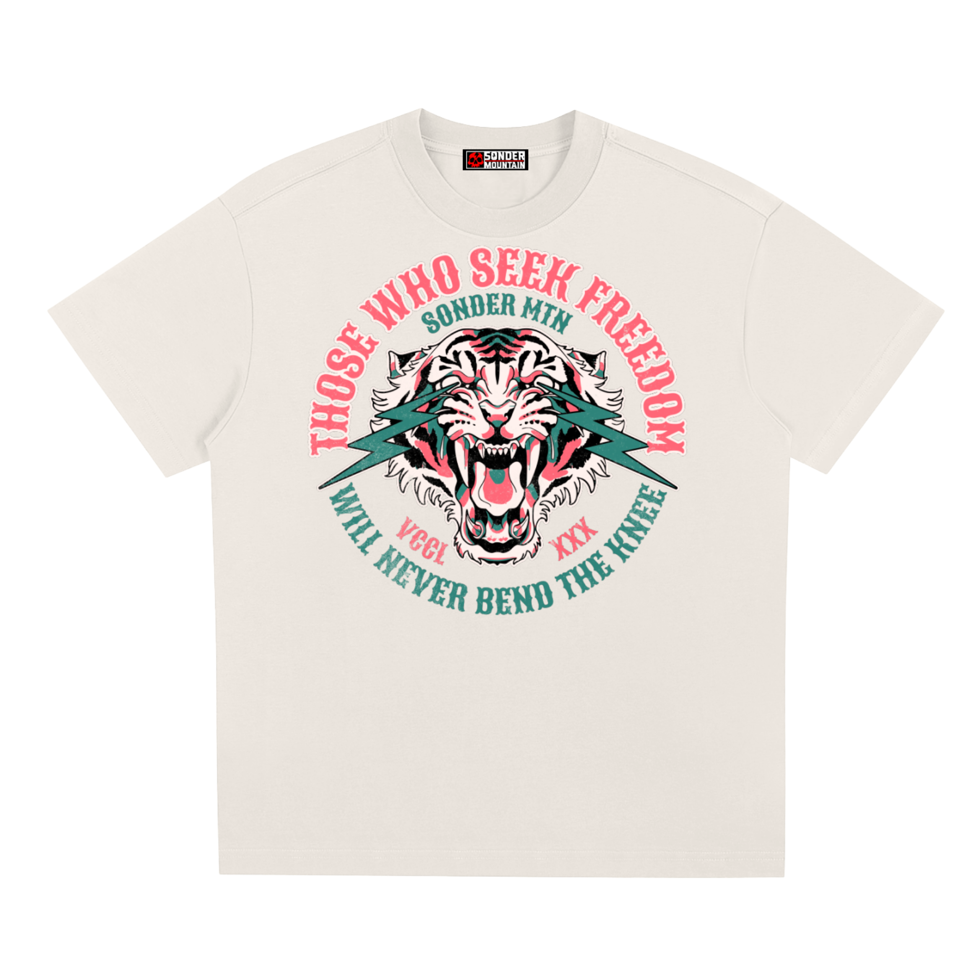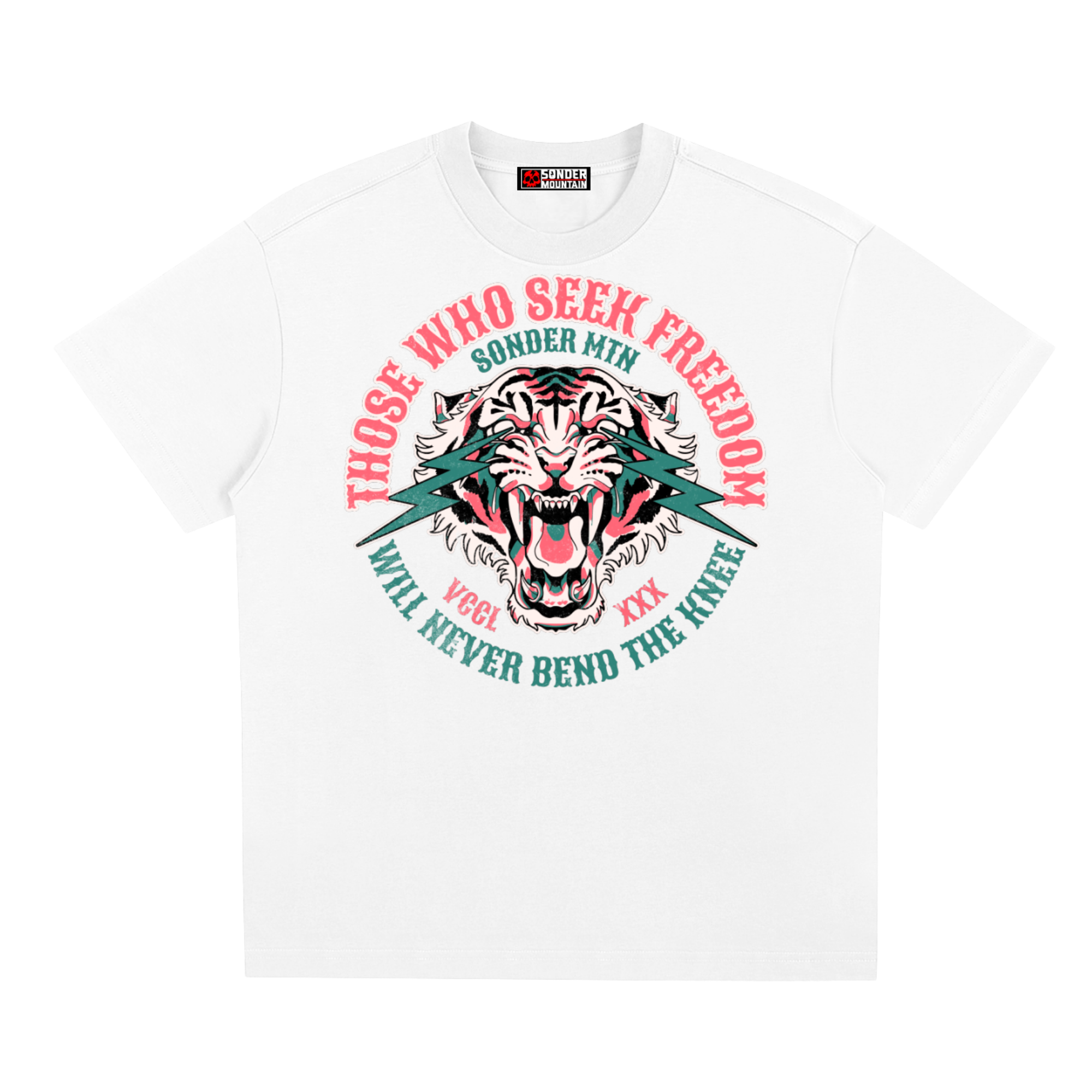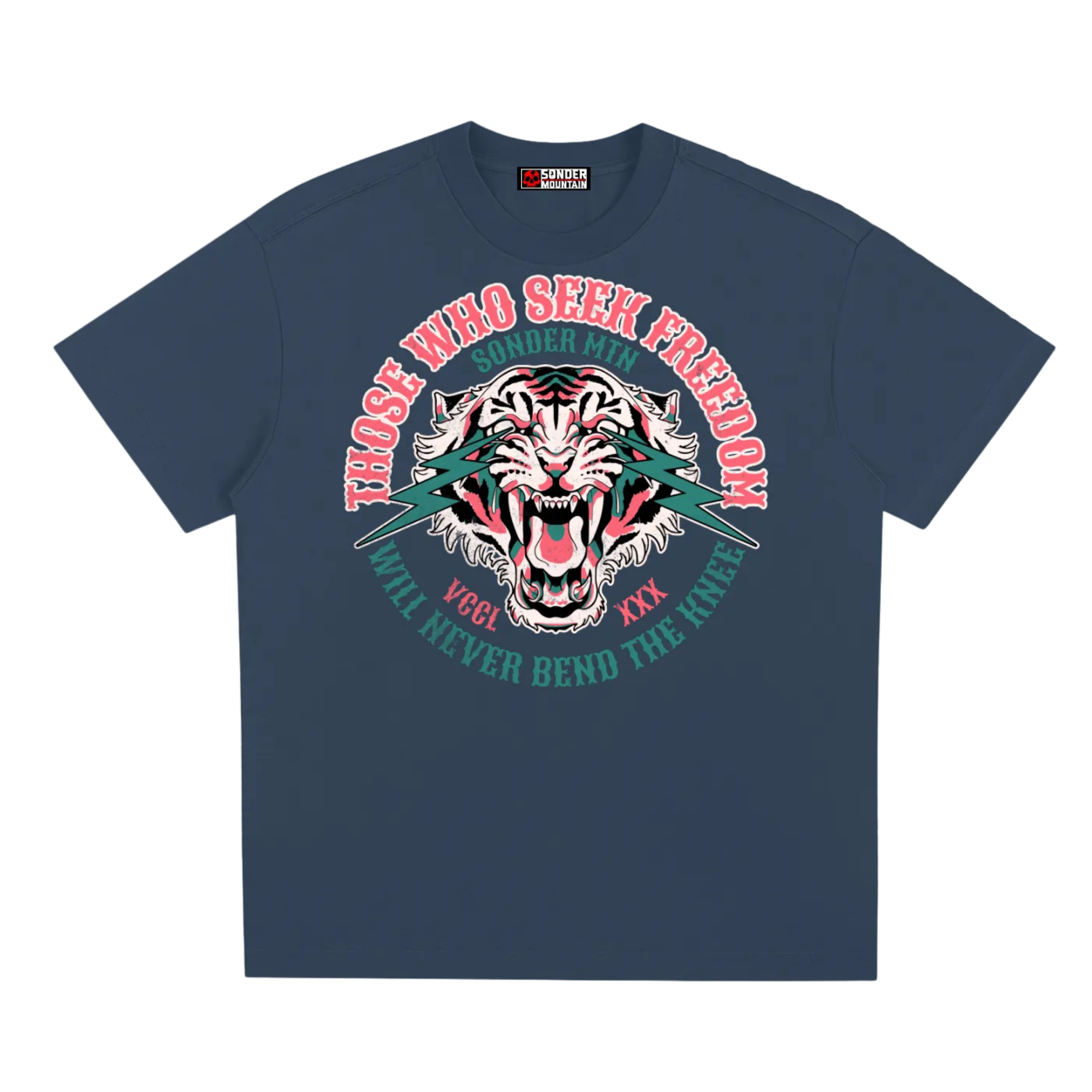 The American traditional tiger — a symbol of strength, vigilance, and untamed will. In tattoo history, the tiger stands for survival through adversity: calm under pressure, power held in reserve, and the courage to face what comes head-on. Paired with the words Those Who Seek Freedom Will Never Bend the Knee, the message is clear and uncompromising.