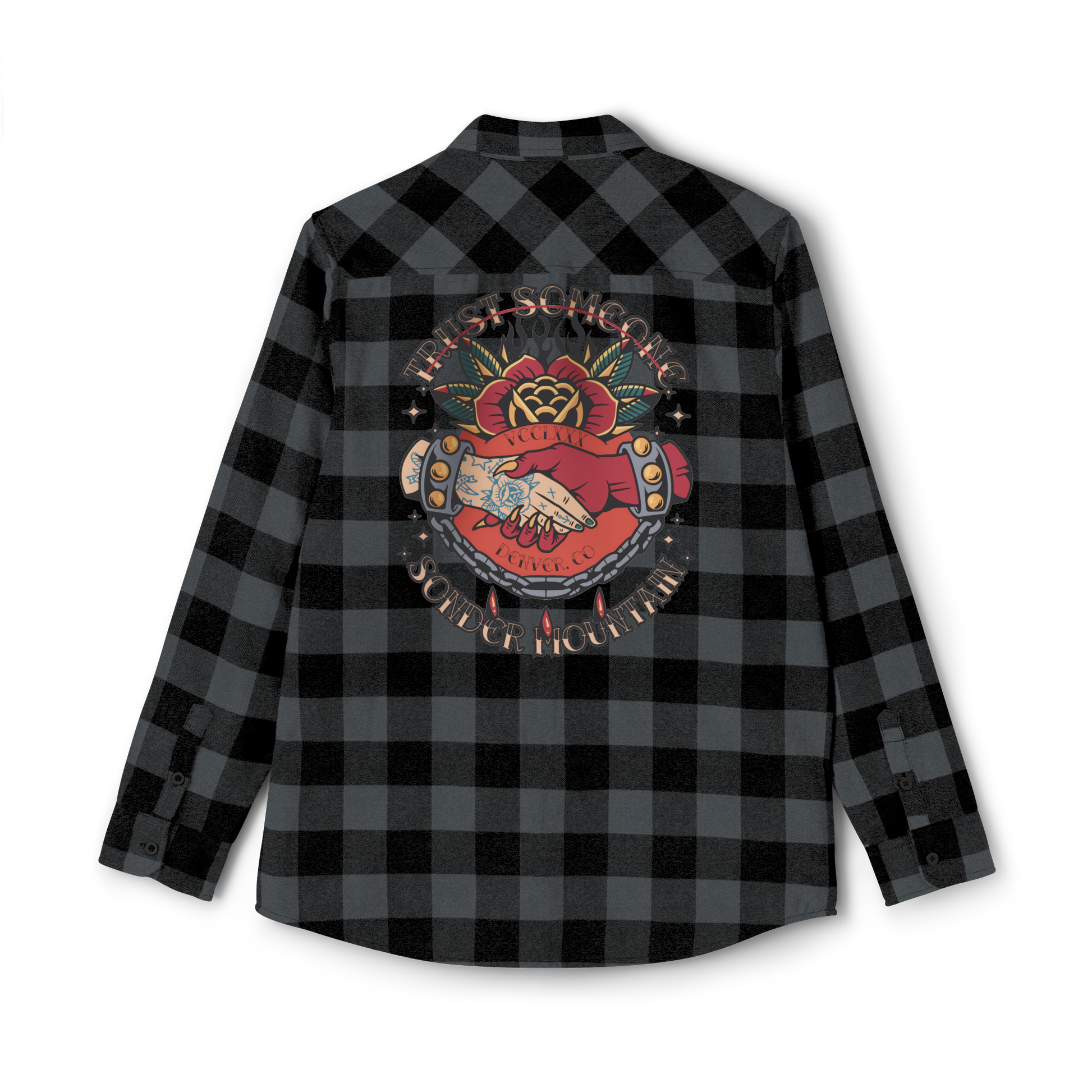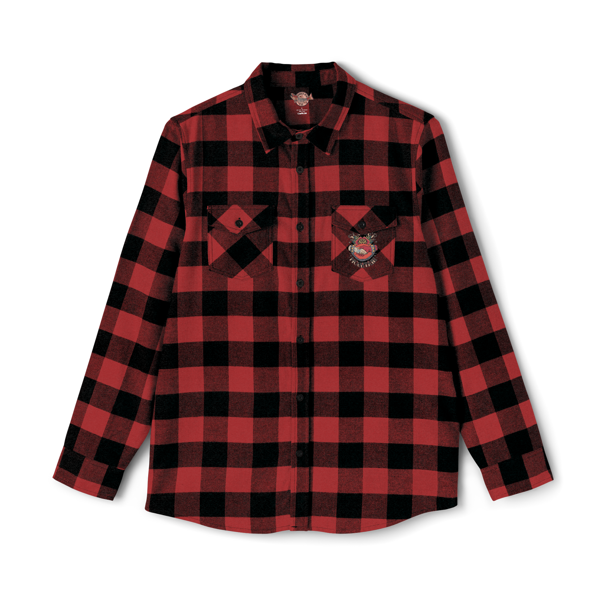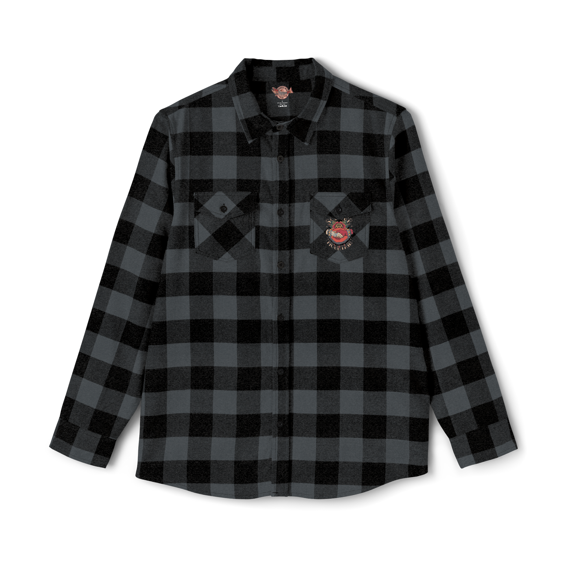 This heavyweight flannel brings warmth and attitude in equal measure. The classic black-and-gray check is a low-key canvas for the vintage-inspired artwork — a bold back crest and a smaller chest motif that nod to old-school tattoo culture. It hangs with structure thanks to a double-layer back yoke, while the brushed 60/40 cotton-poly blend feels soft against the skin and holds up to repeated wear. Wear it over a tee on chilly mornings, layered under a jacket for colder nights, or buttoned up for a streetwise, lived-in look that ages well.